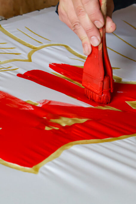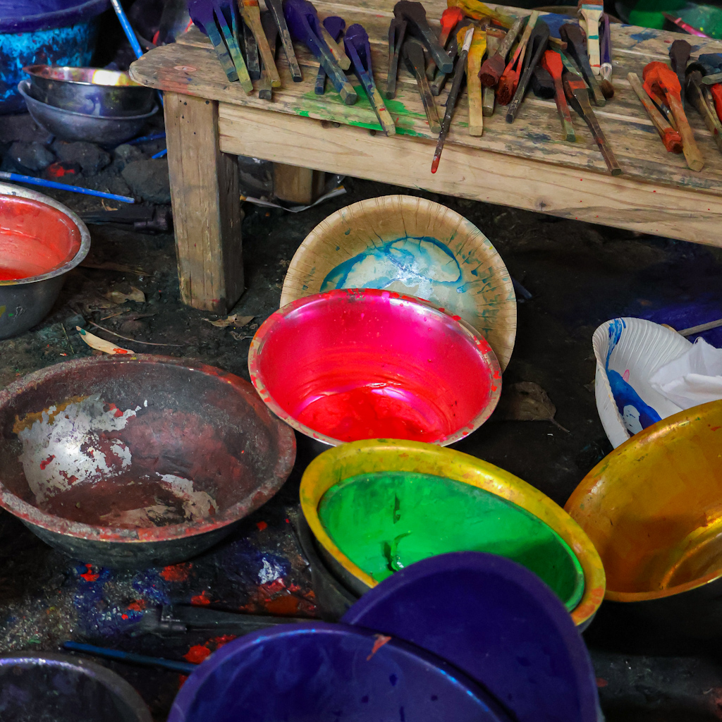 Once the outlines are fixed, the painting begins. Bright pigments, sometimes mixed with natural dyes, are brushed across the fabric in wide, sweeping motions.