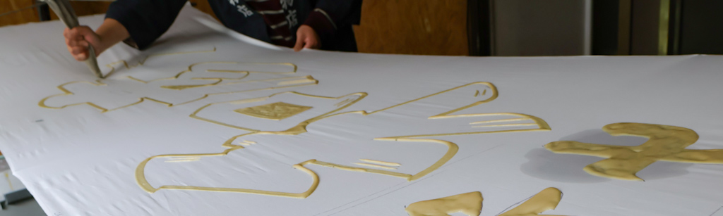 “Originally, these flags were very simple,” he explained while deftly applying paste to cloth. “Fishermen would hoist a flag to tell their families they had returned with a big catch. All it needed was the name of the boat, the word ‘大漁’ (tairyō, ‘big catch’), and the name of the sender. No pictures—just words bold enough to be read from far away.”