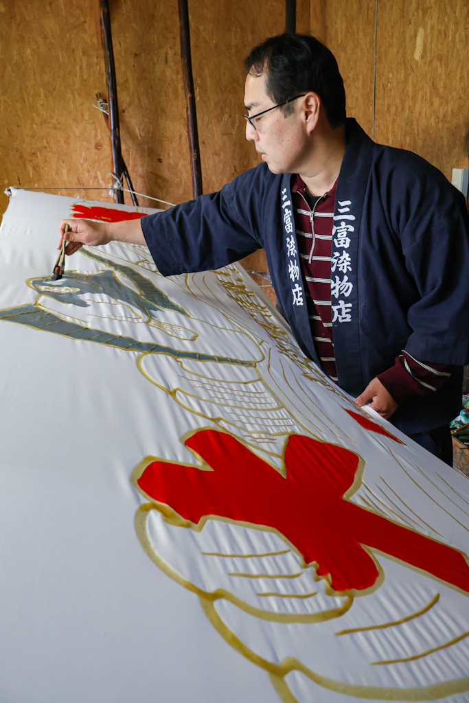 I visited the workshop of Mitomi-san, a seventh-generation craftsman to watch him at work and to better understand the artistry, history, and symbolism woven into every flag.